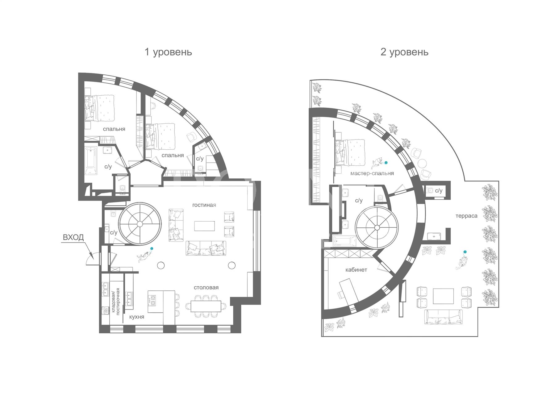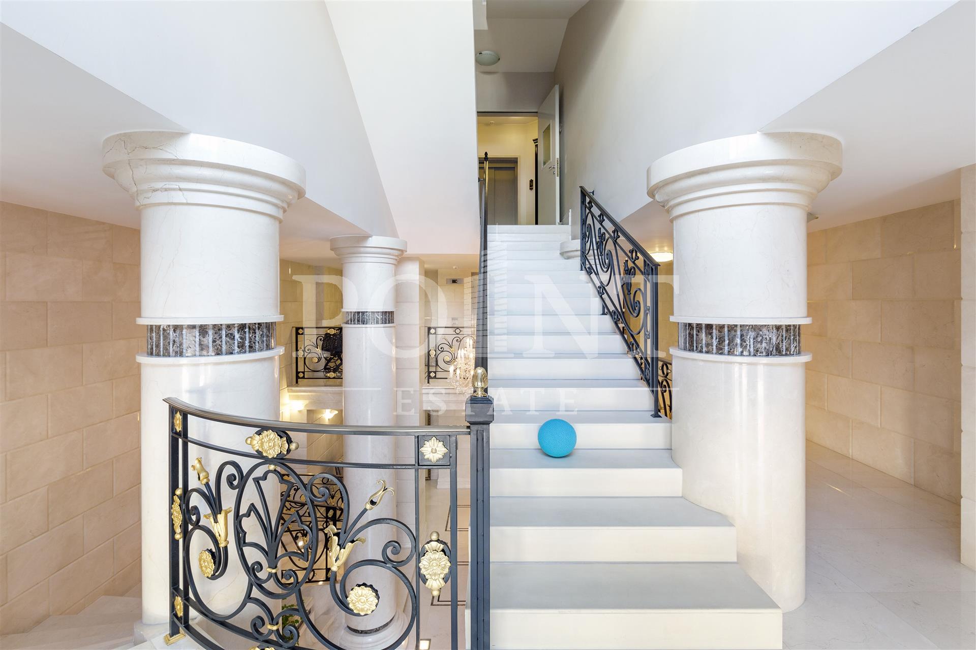 На продажу предлагается видовой двухуровневый пентхаус, площадью 255 кв.м., с террасой 50 кв.м. в клубном доме "Большая Никитская 45". Возможная планировка: 1-й уровень: гостиная, кухня-столовая, две спальни со своими санузлами, гостевой санузел, постирочная, прихожая, балкон; 2-й уровень: кухня, спальня с гардеробной и санузлом, кабинет, гостевой санузел, терраса. Высота потолков - 3,3 м. на первом уровне, от 2,44 до 3,77 м. на втором. Собственный лифт на этаж. Также имеется возможность объединения с соседним двухэтажным пентхаусом. Два машиноместа в подземном паркинге по запросу. Удобная транспортная доступность и развитая инфраструктура района.