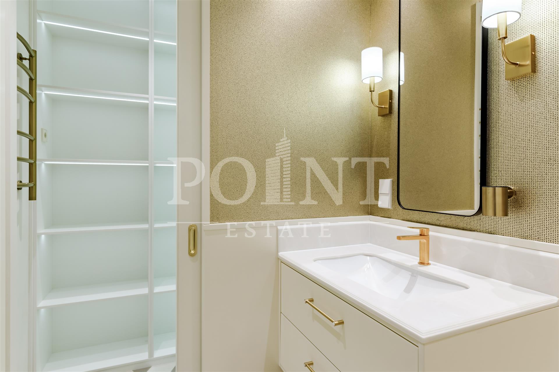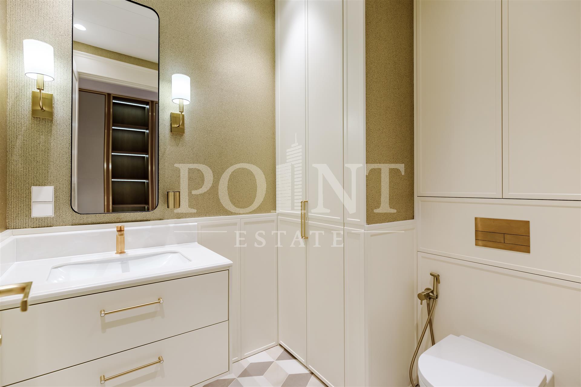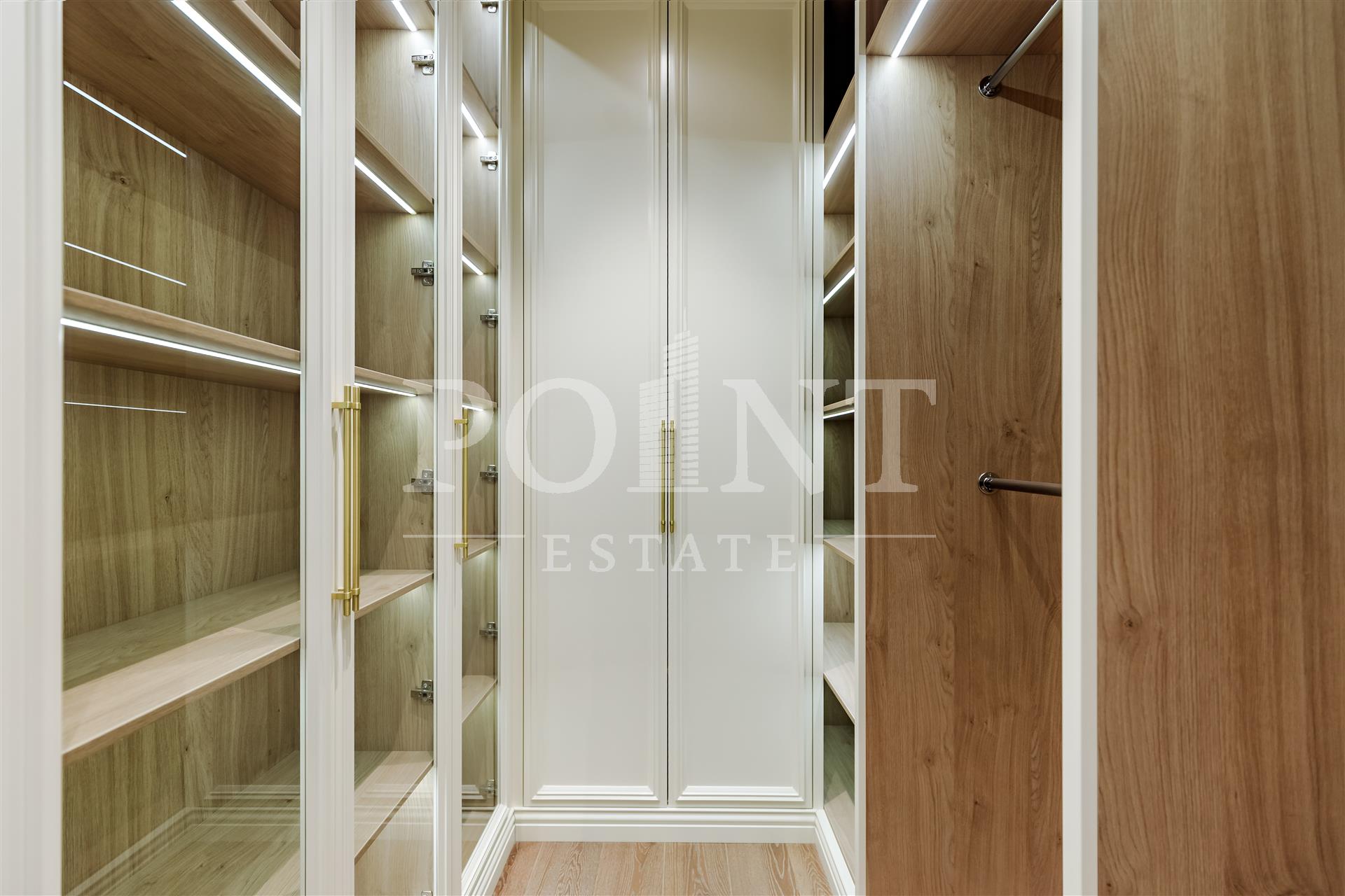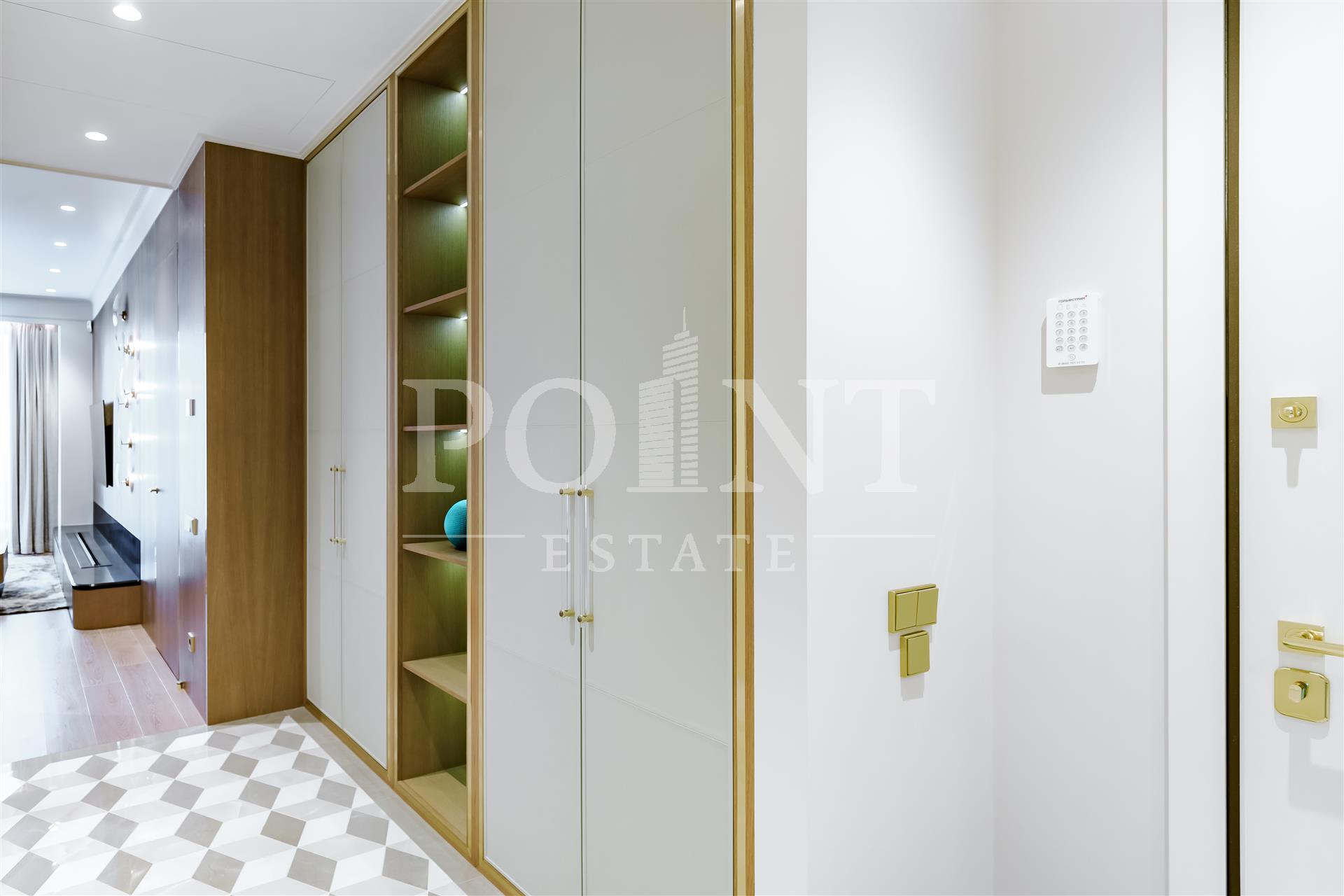 Четырехкомнатная квартира, площадью 138,2 кв.м., в жилом комплексе Prime Park. Планировка: кухня-гостиная, спальня с санузлом, спальня с гардеробной и санузлом, кабинет, гостевой санузел, прихожая. Для отделки использованы высококачественные материалы: на полу в жилых зонах уложена инженерная доска, в санузлах премиальный итальянский керамогранит, а в прихожей итальянская плитка. Стены декорированы уникальными ручными обоями ведущих европейских брендов Fresq, GEO.44, Arte, потолки представляют собой изящные подвесные конструкции с лепниной ручной работы. Интерьер в санузлах дополняют предметы сантехники от известных производителей Villeroy & Boch (Германия), Giulnig (Италия), Tres (Испания). Вся корпусная мебель, шкафы, стеновые панели и двери изготовлены индивидуально под заказ специально для данной квартиры. Для поддержания идеального микроклимата установлен современный климатический комплекс с фанкойлами производства японской компании DAIKON.