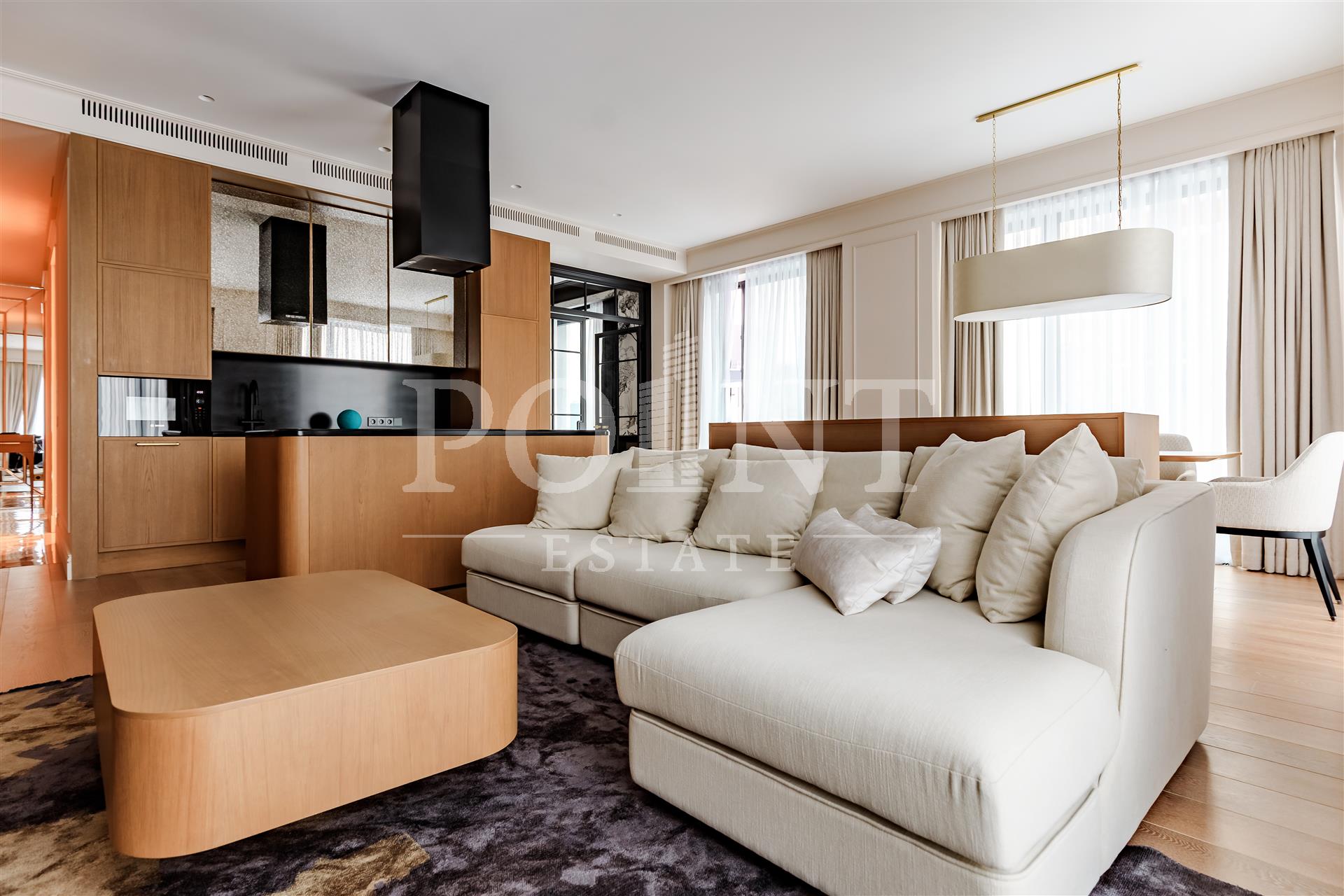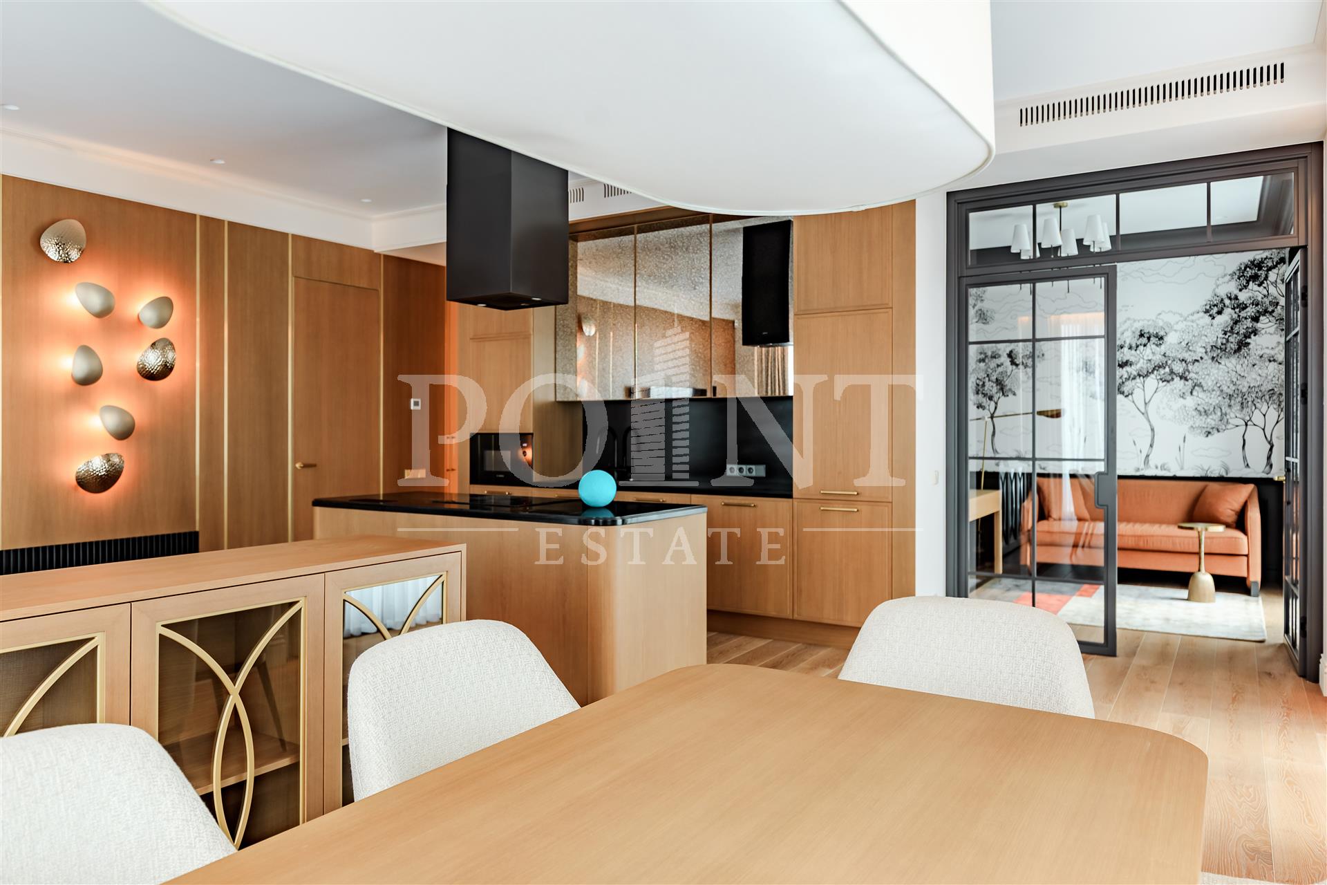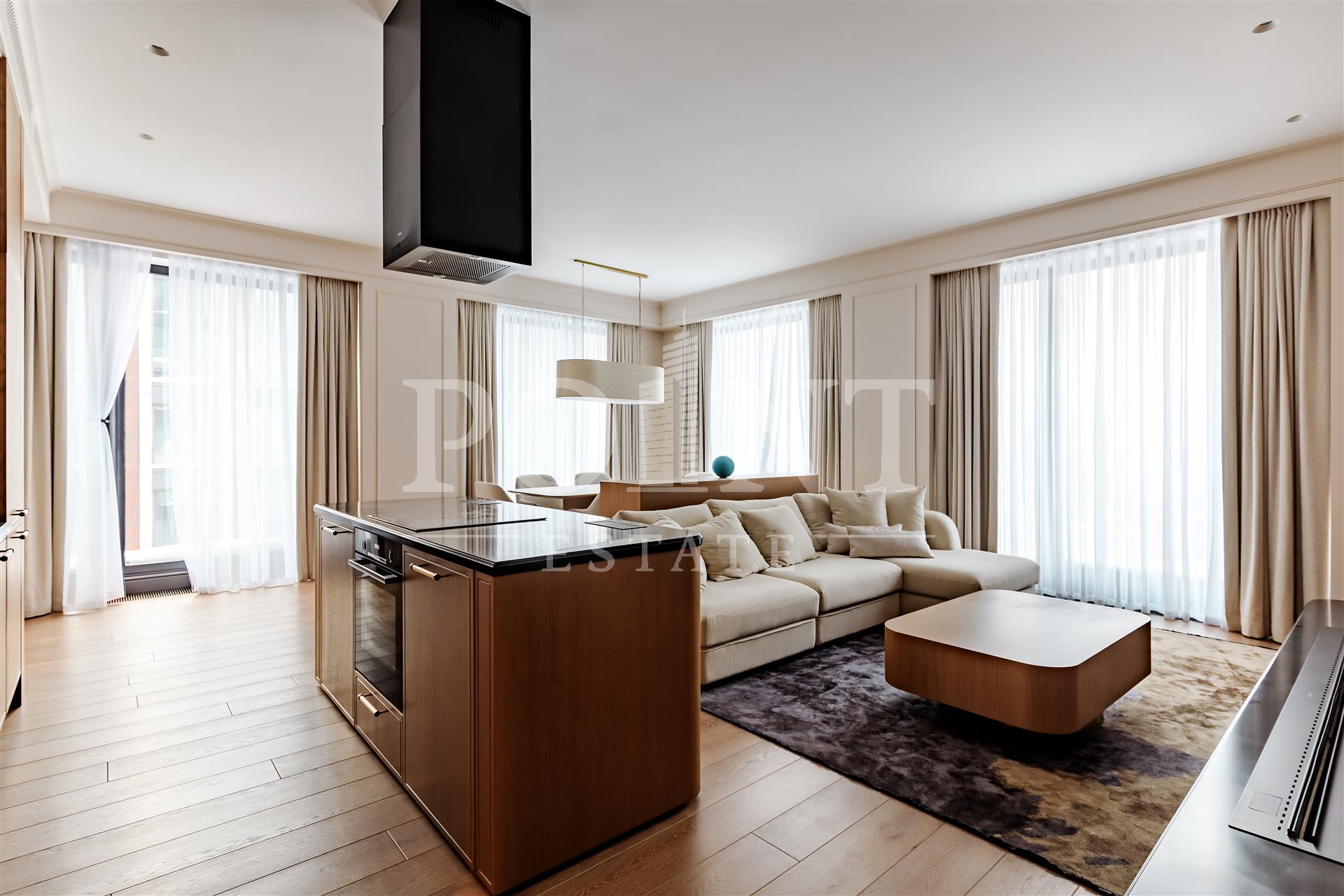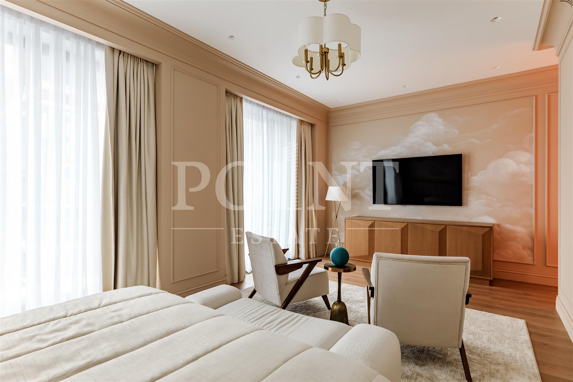 Четырехкомнатная квартира, площадью 138,2 кв.м., в жилом комплексе Prime Park. Планировка: кухня-гостиная, спальня с санузлом, спальня с гардеробной и санузлом, кабинет, гостевой санузел, прихожая. Для отделки использованы высококачественные материалы: на полу в жилых зонах уложена инженерная доска, в санузлах премиальный итальянский керамогранит, а в прихожей итальянская плитка. Стены декорированы уникальными ручными обоями ведущих европейских брендов Fresq, GEO.44, Arte, потолки представляют собой изящные подвесные конструкции с лепниной ручной работы. Интерьер в санузлах дополняют предметы сантехники от известных производителей Villeroy & Boch (Германия), Giulnig (Италия), Tres (Испания). Вся корпусная мебель, шкафы, стеновые панели и двери изготовлены индивидуально под заказ специально для данной квартиры. Для поддержания идеального микроклимата установлен современный климатический комплекс с фанкойлами производства японской компании DAIKON.