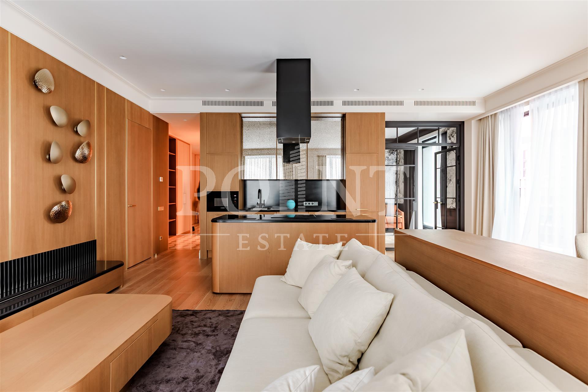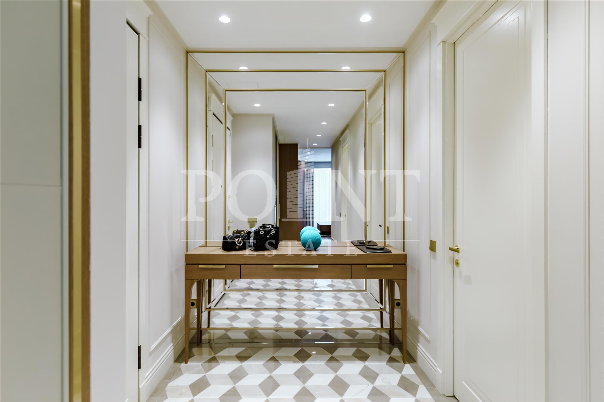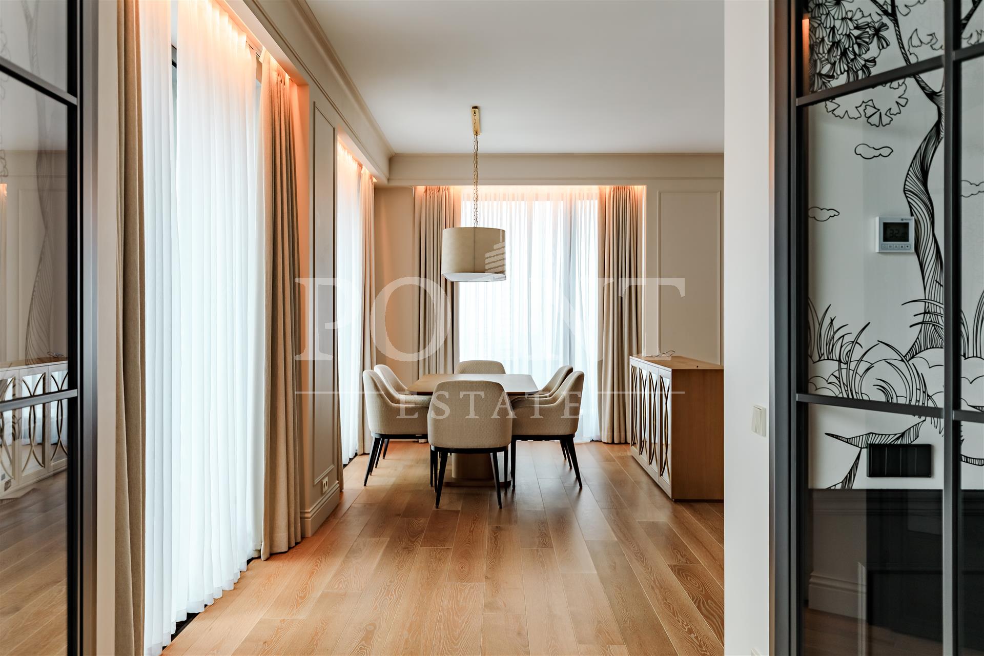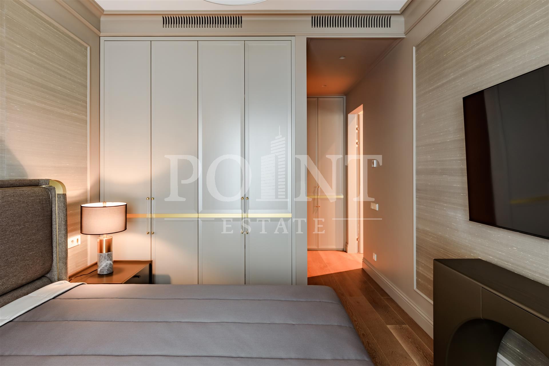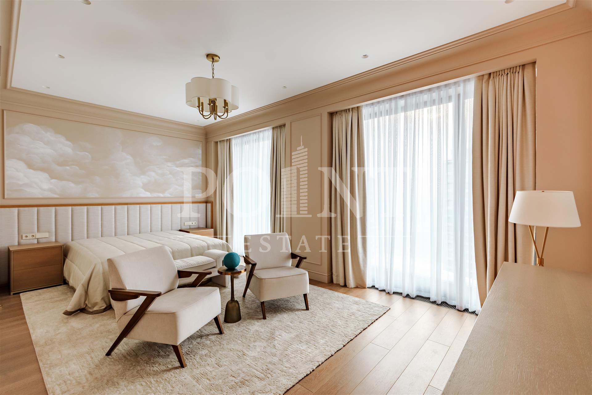 Четырехкомнатная квартира, площадью 138,2 кв.м., в жилом комплексе Prime Park. Планировка: кухня-гостиная, спальня с санузлом, спальня с гардеробной и санузлом, кабинет, гостевой санузел, прихожая. Для отделки использованы высококачественные материалы: на полу в жилых зонах уложена инженерная доска, в санузлах премиальный итальянский керамогранит, а в прихожей итальянская плитка. Стены декорированы уникальными ручными обоями ведущих европейских брендов Fresq, GEO.44, Arte, потолки представляют собой изящные подвесные конструкции с лепниной ручной работы. Интерьер в санузлах дополняют предметы сантехники от известных производителей Villeroy & Boch (Германия), Giulnig (Италия), Tres (Испания). Вся корпусная мебель, шкафы, стеновые панели и двери изготовлены индивидуально под заказ специально для данной квартиры. Для поддержания идеального микроклимата установлен современный климатический комплекс с фанкойлами производства японской компании DAIKON.