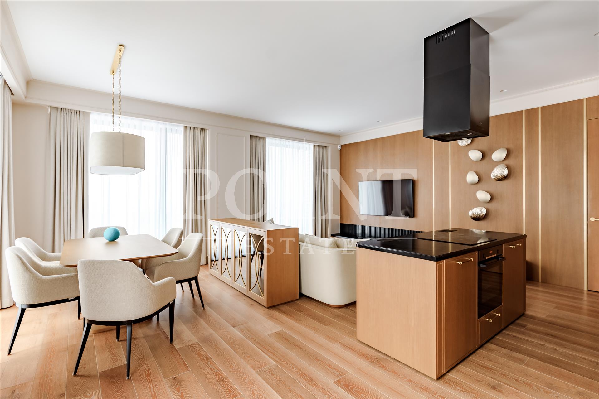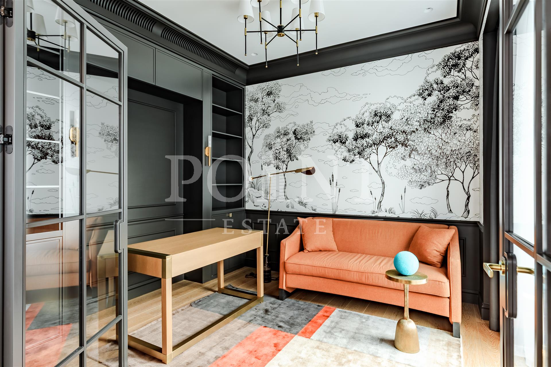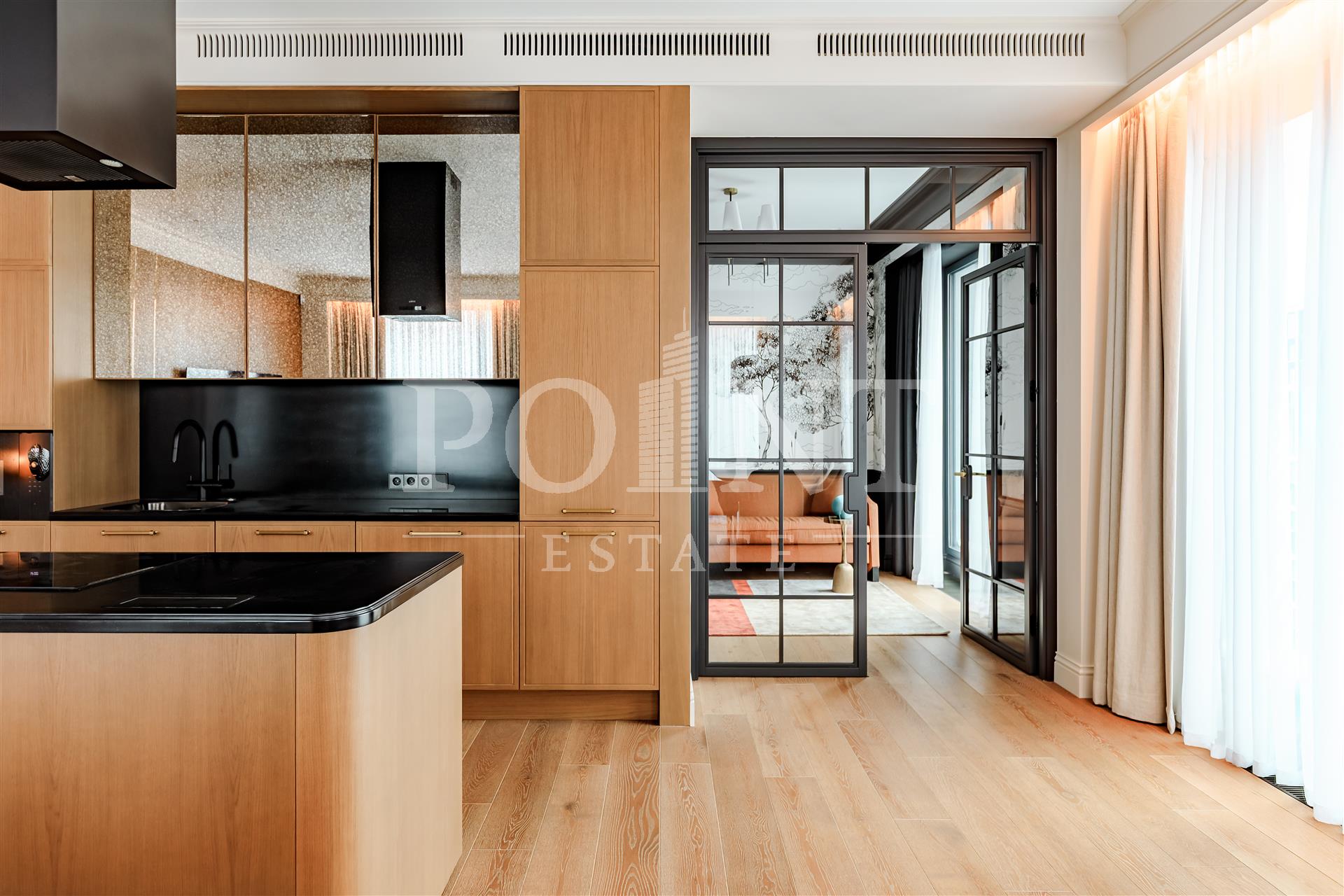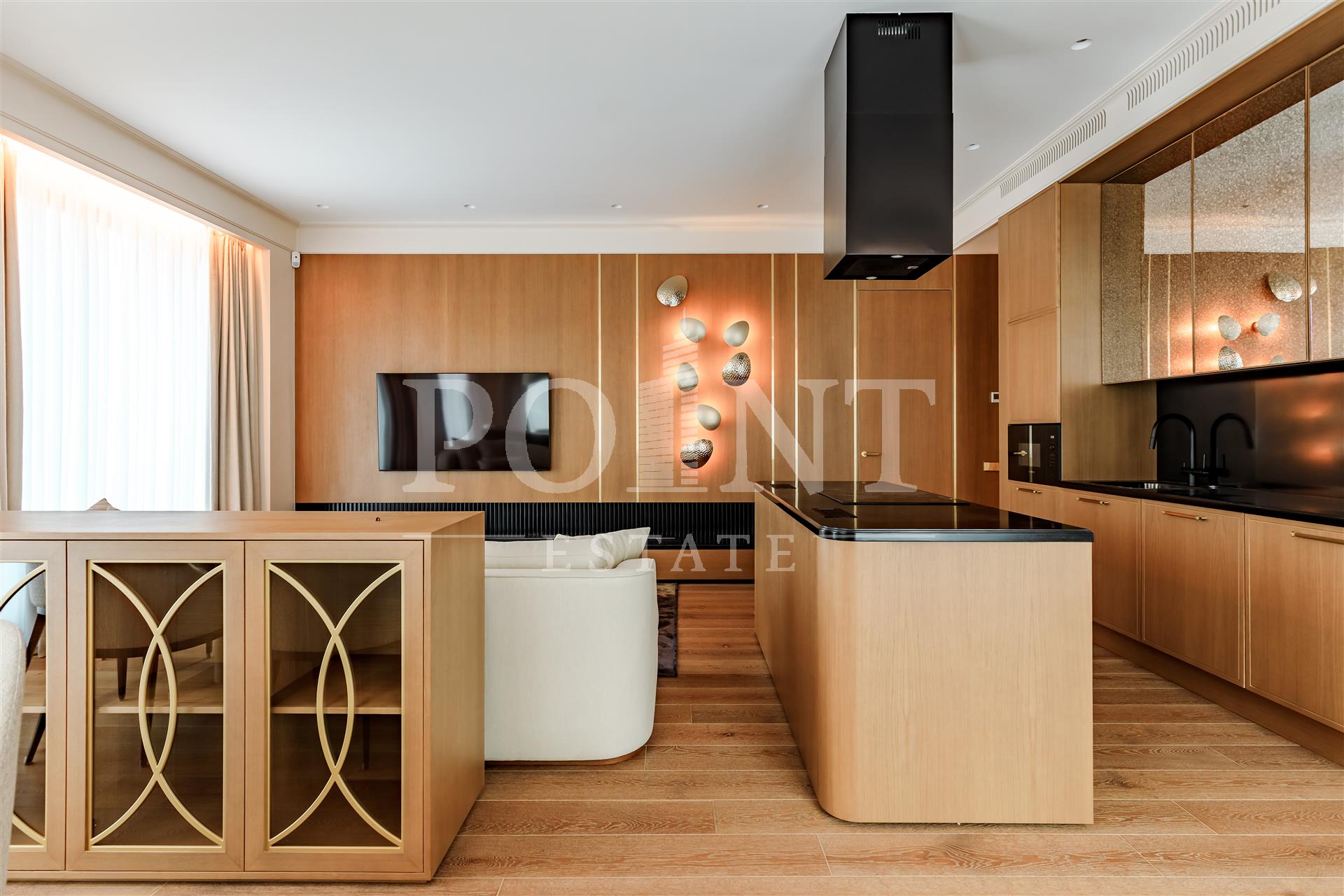 Четырехкомнатная квартира, площадью 138,2 кв.м., в жилом комплексе Prime Park. Планировка: кухня-гостиная, спальня с санузлом, спальня с гардеробной и санузлом, кабинет, гостевой санузел, прихожая. Для отделки использованы высококачественные материалы: на полу в жилых зонах уложена инженерная доска, в санузлах премиальный итальянский керамогранит, а в прихожей итальянская плитка. Стены декорированы уникальными ручными обоями ведущих европейских брендов Fresq, GEO.44, Arte, потолки представляют собой изящные подвесные конструкции с лепниной ручной работы. Интерьер в санузлах дополняют предметы сантехники от известных производителей Villeroy & Boch (Германия), Giulnig (Италия), Tres (Испания). Вся корпусная мебель, шкафы, стеновые панели и двери изготовлены индивидуально под заказ специально для данной квартиры. Для поддержания идеального микроклимата установлен современный климатический комплекс с фанкойлами производства японской компании DAIKON.