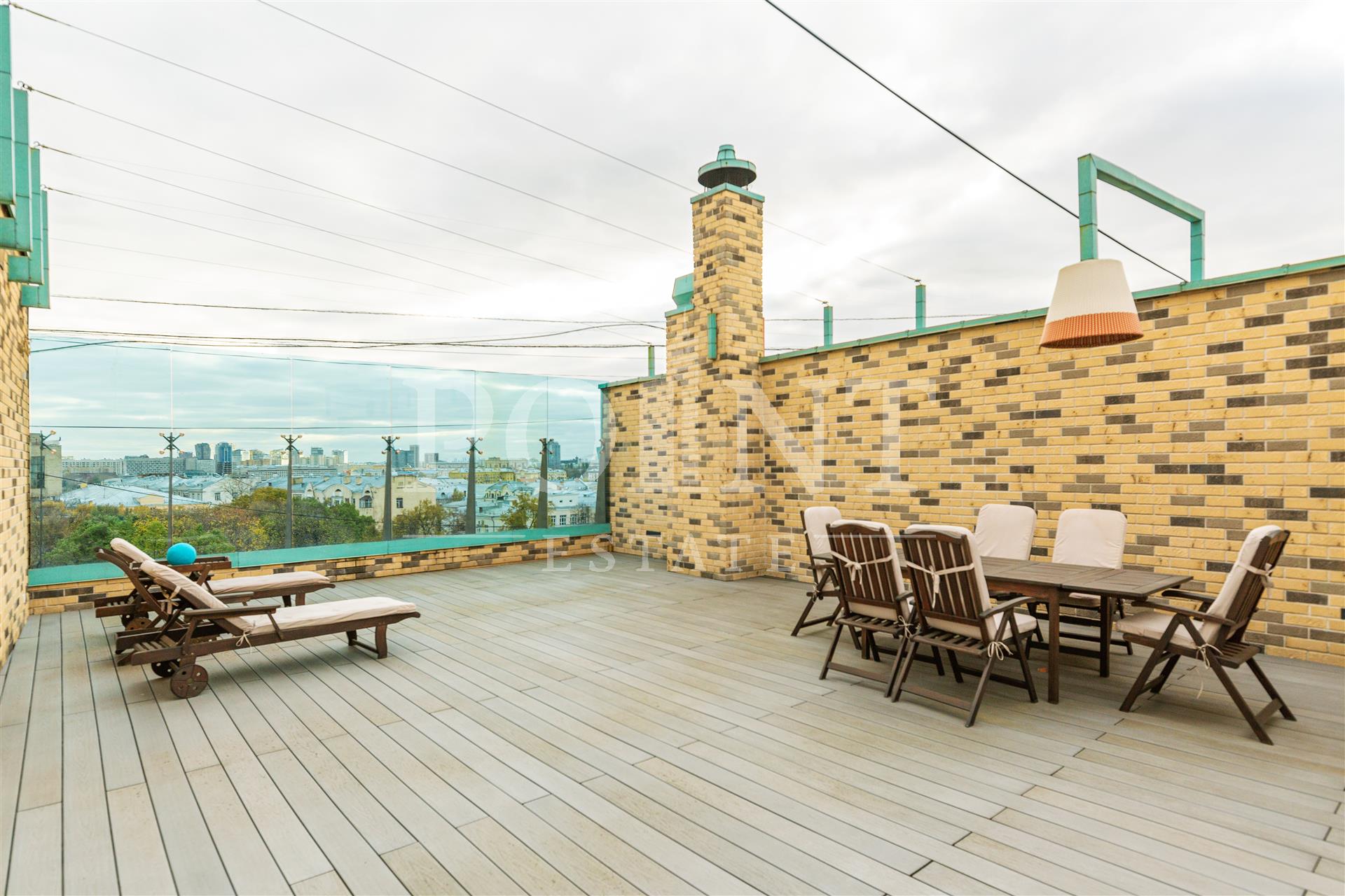 Роскошный трехуровневый пентхаус с дизайнерским ремонтом на Пречистенке. Планировка: 1й уровень: две спальни с санузлами, одна из которых с гардеробной, кабинет, совмещенный санузел, прихожая; 2й уровень: гостиная-столовая, кухня, спальня, гостевой санузел, балкон; 3й уровень: спальня с санузлом, кабинет, совмещенный санузел, прихожая, терраса. Два фиксированных машиноместа на наземной парковке входят в стоимость.