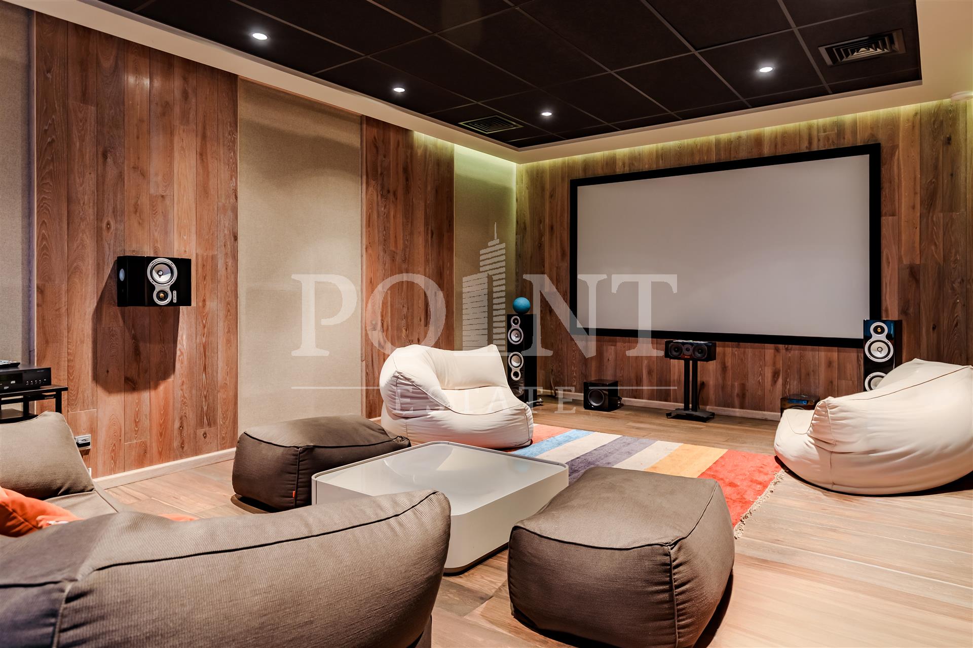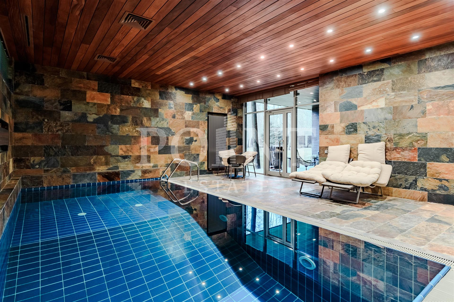 холл, гостиная с камином, кухня-столовая, спальня с гардеробной и санузлом, кинотеатр, бассейн, сауна, душевая, комната отдыха, 1/2 санузла, терраса, гардеробная, постирочная