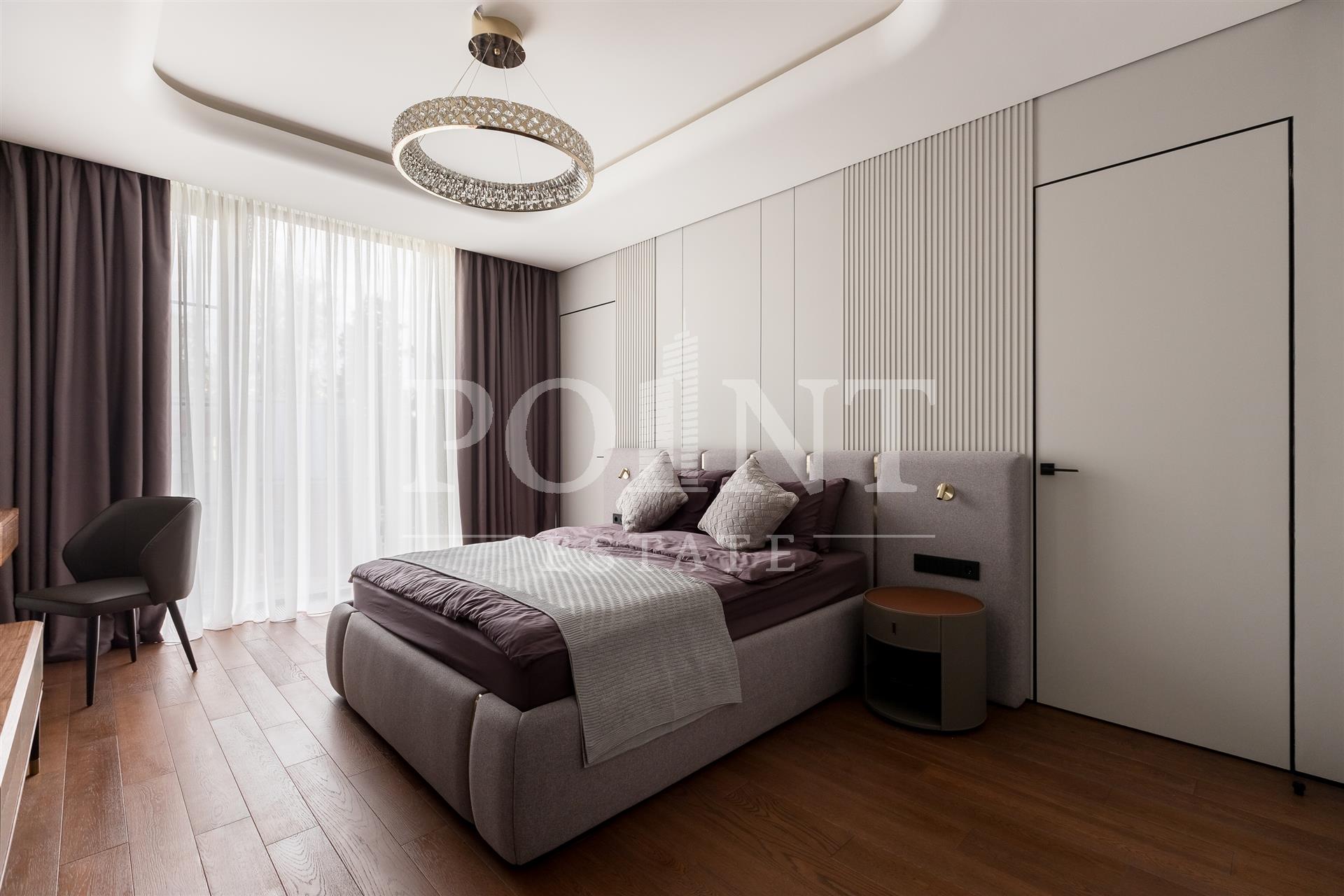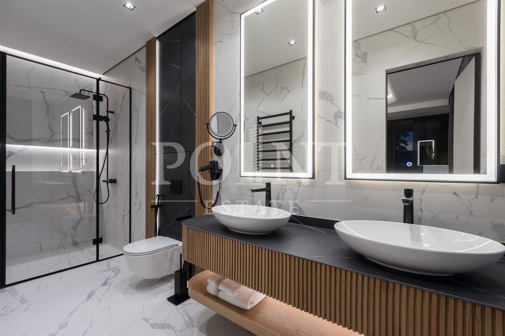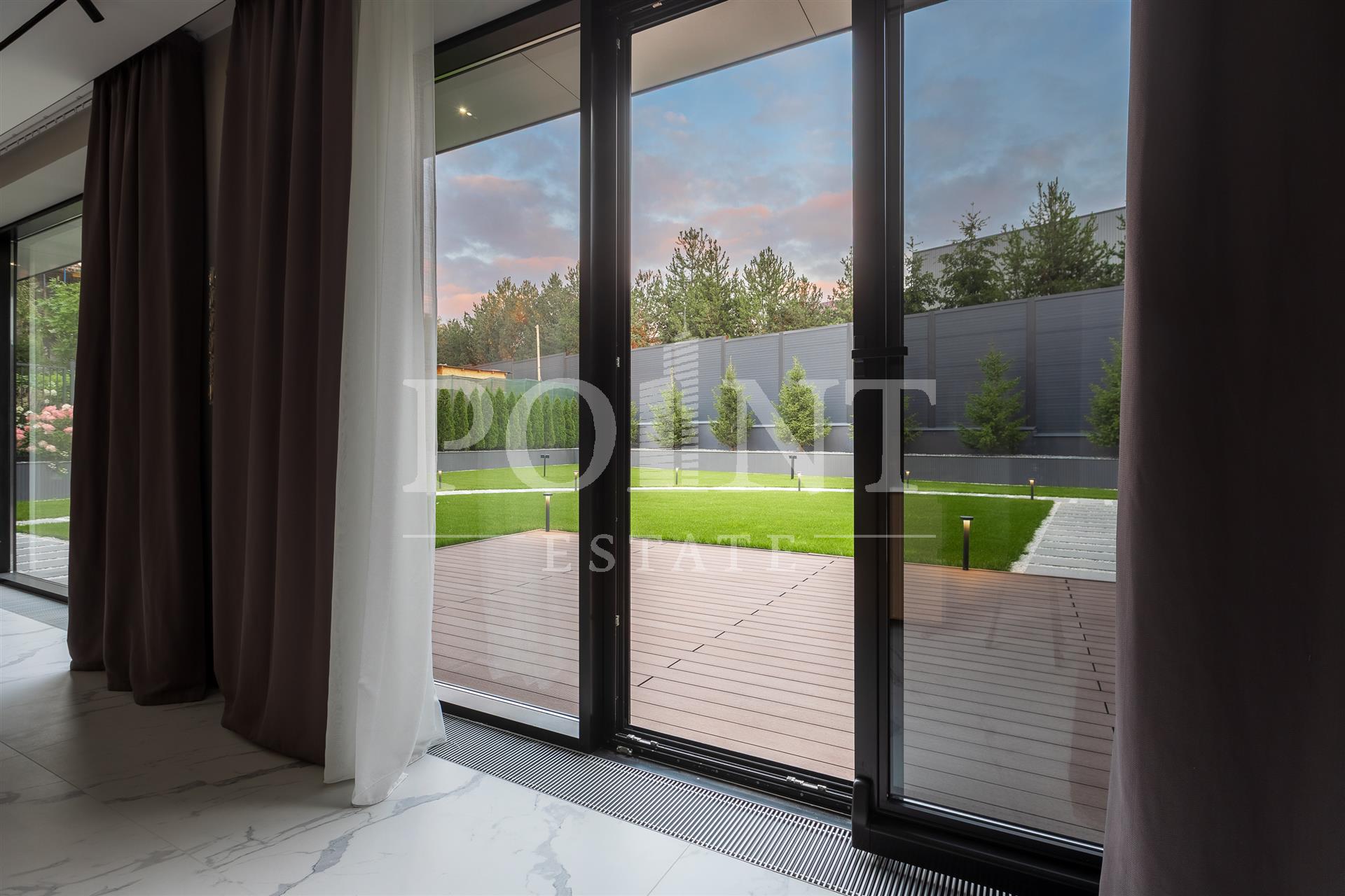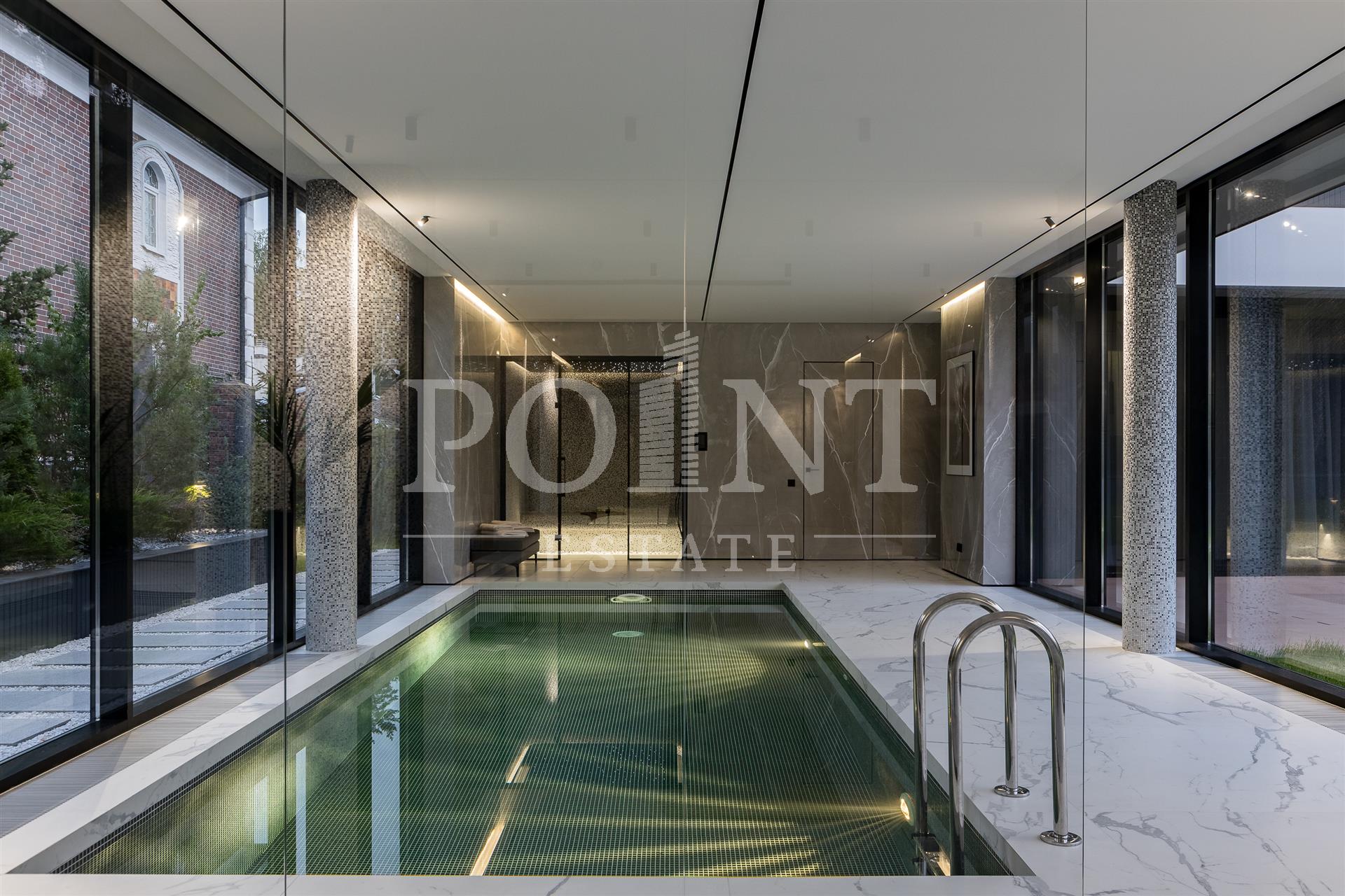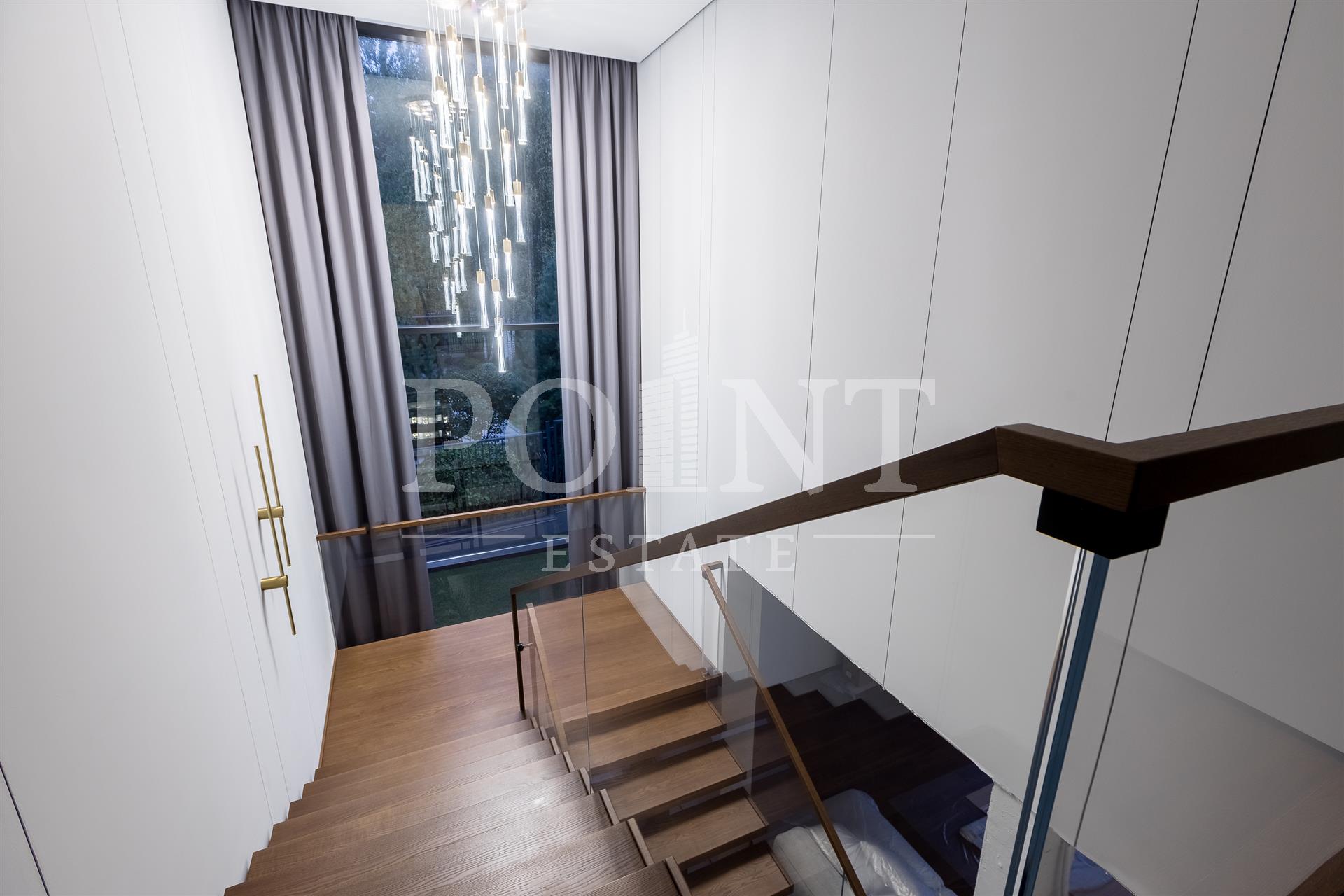 Предлагается на продажу современный новый, меблированный дом "под ключ" с панорамным остеклением и террасами. Планировка дома: 1 этаж: Холл, гардеробная, санузлом, постирочная, гостевая спальня с санузлом, гостиная, кухня, кладовая, столовая с выходом на террасу, спа зона: хамам, санузлом, бассейн, спортзал, гараж на 2 авто, квартира для персонала с отдельным входом; 2 этаж: Мастер спальня с санузлом и 2 гардеробными, спальня с санузлом и гардеробной, спальня с санузлом, гардеробной и кабинетом, холл. Выход на эксплуатируемую кровлю.