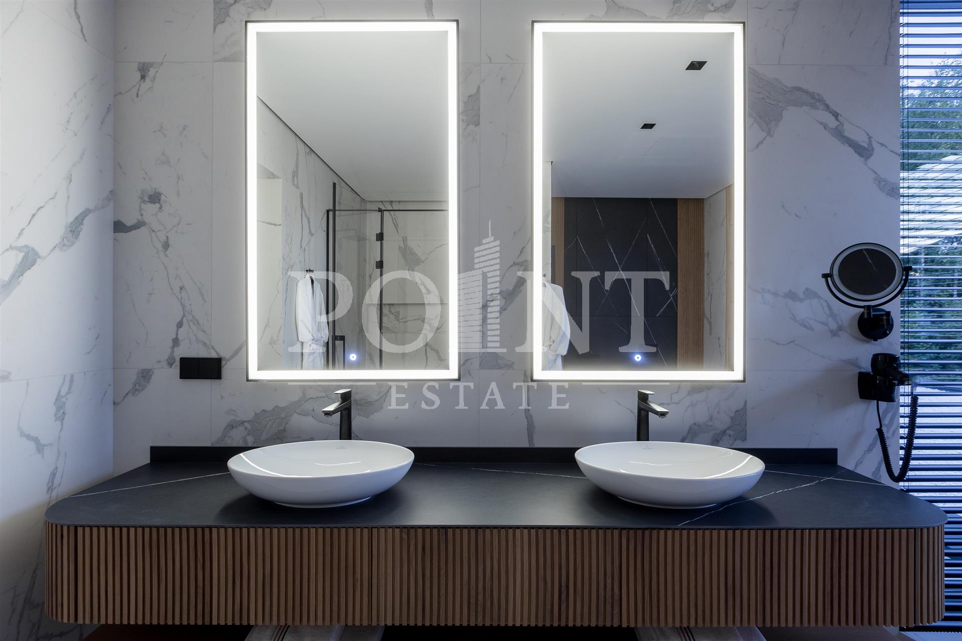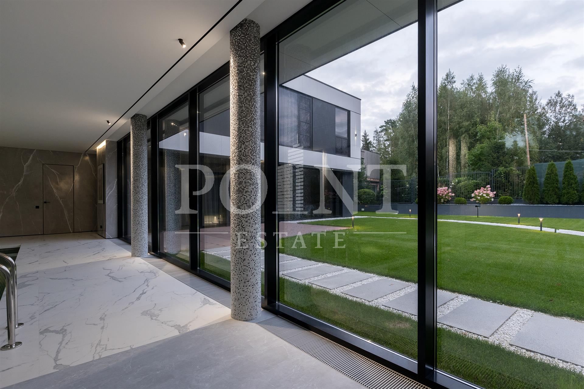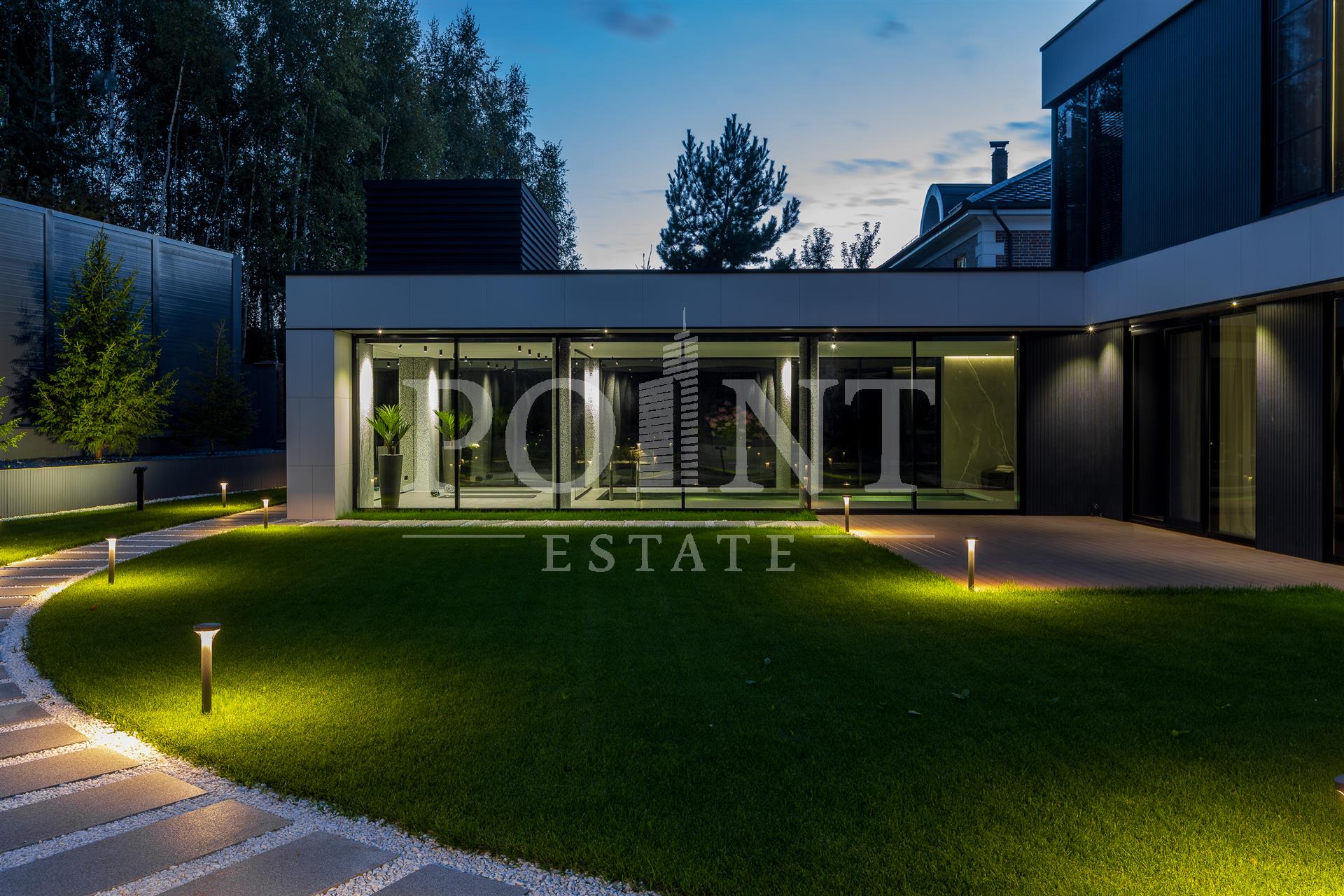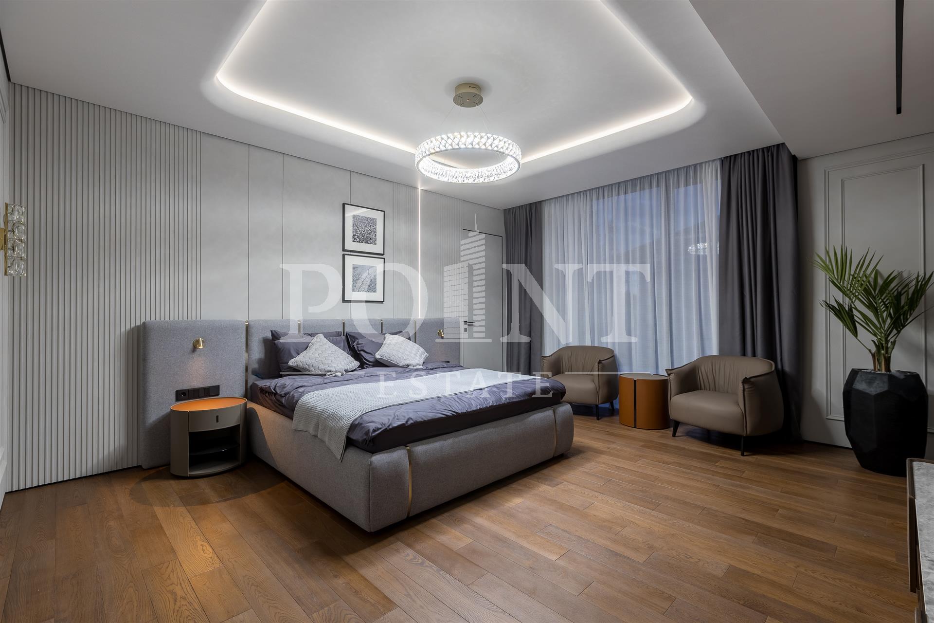 Предлагается на продажу современный новый, меблированный дом "под ключ" с панорамным остеклением и террасами. Планировка дома: 1 этаж: Холл, гардеробная, санузлом, постирочная, гостевая спальня с санузлом, гостиная, кухня, кладовая, столовая с выходом на террасу, спа зона: хамам, санузлом, бассейн, спортзал, гараж на 2 авто, квартира для персонала с отдельным входом; 2 этаж: Мастер спальня с санузлом и 2 гардеробными, спальня с санузлом и гардеробной, спальня с санузлом, гардеробной и кабинетом, холл. Выход на эксплуатируемую кровлю.