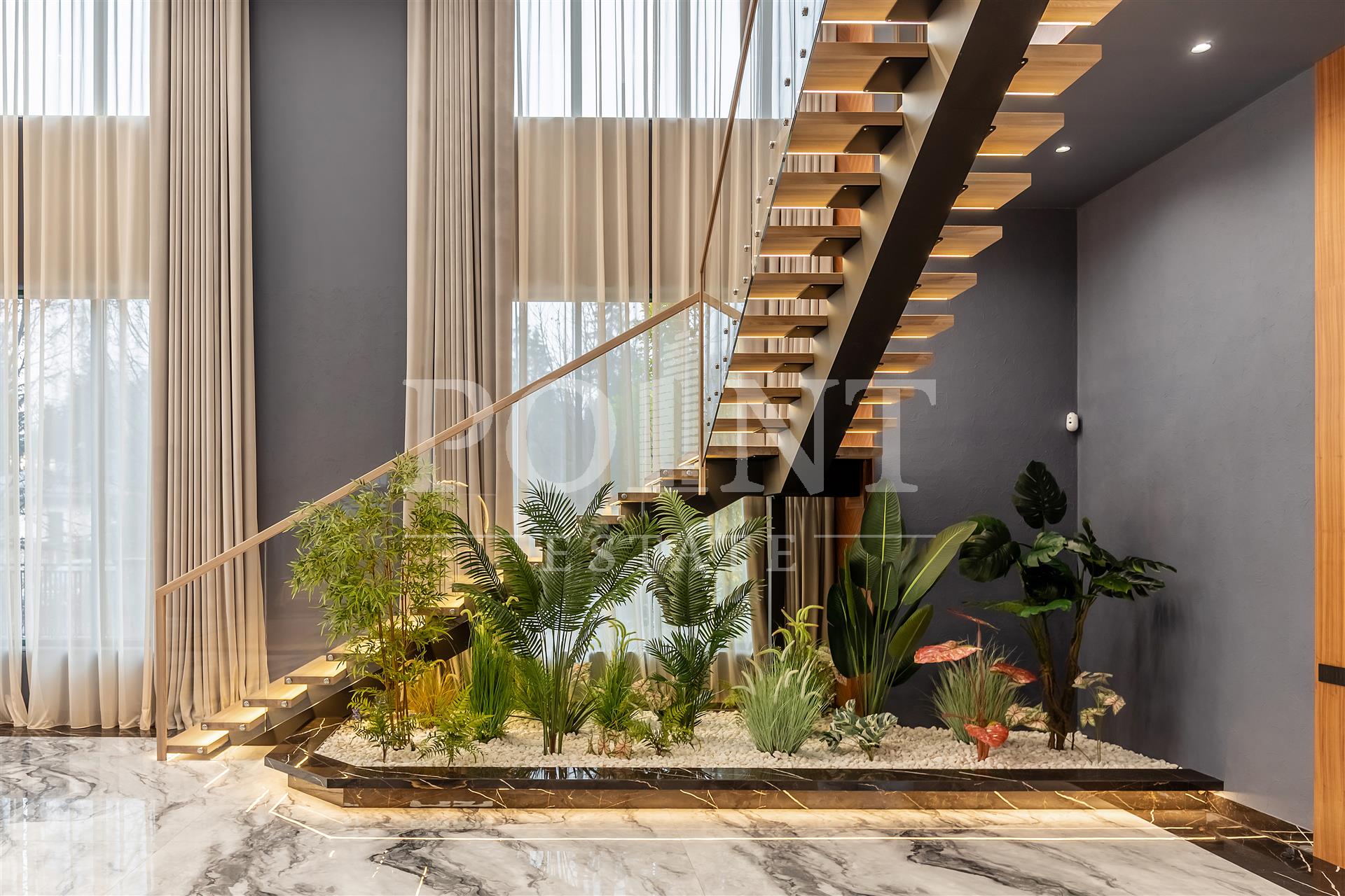 Концепция основана на стиле «органической архитектуры» Фрэнка Ллойда Райта: дома с открытыми планами, горизонтальными линиями, широкими террасами, панорамным остеклением и отделкой природными материалами. На 110 участках возведены особняки площадью от 390 до 900 кв.м на участках от 17 до 78 соток.