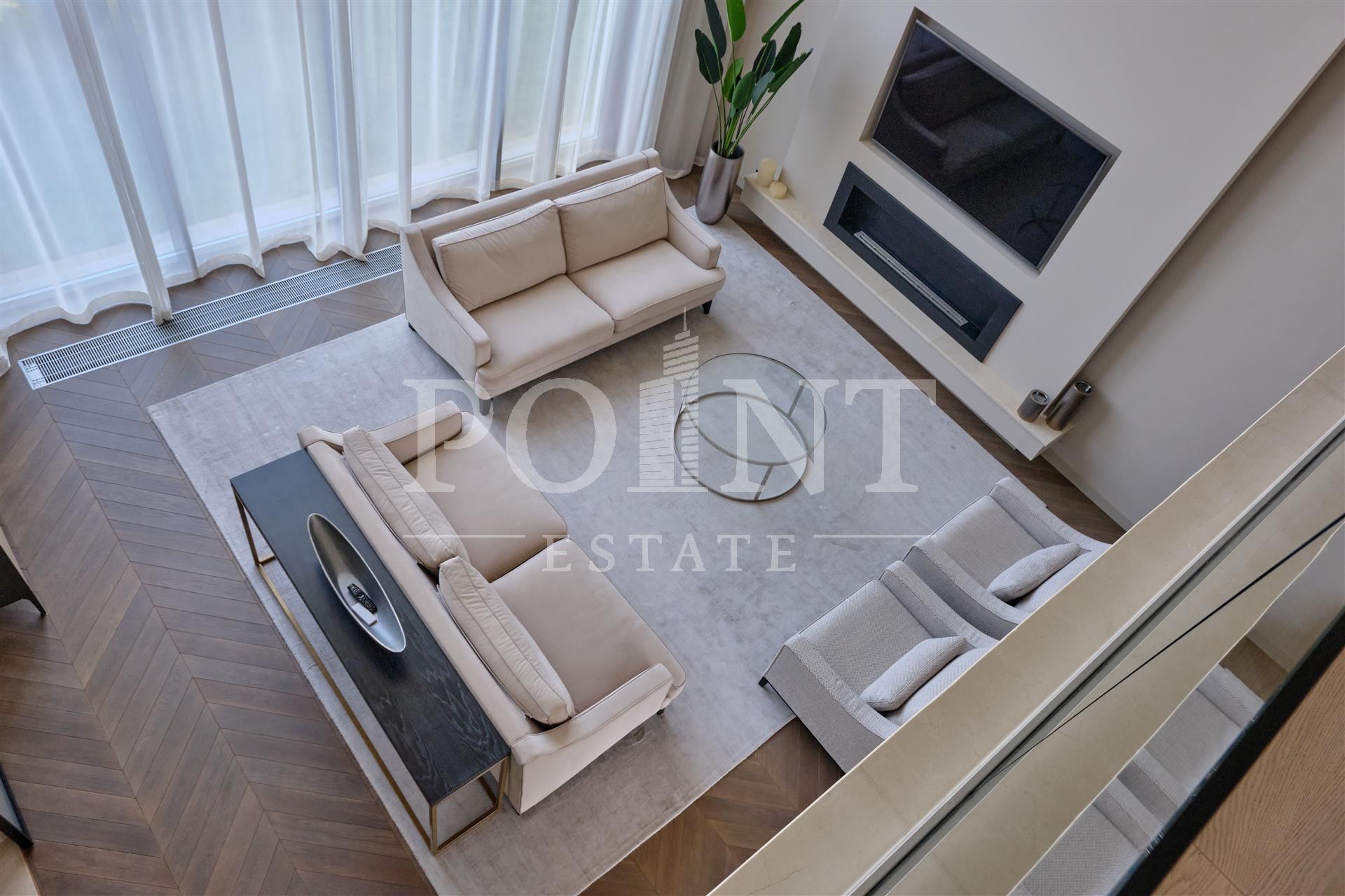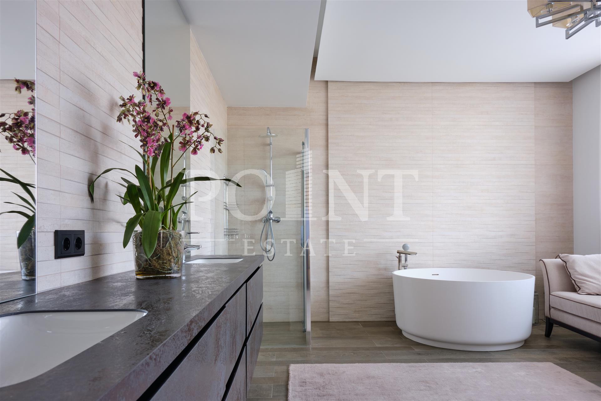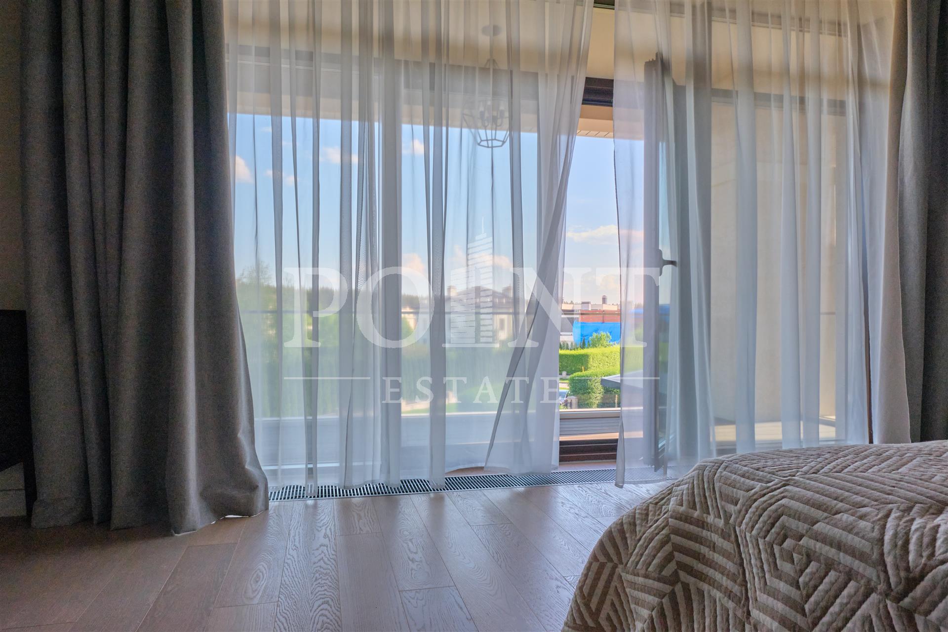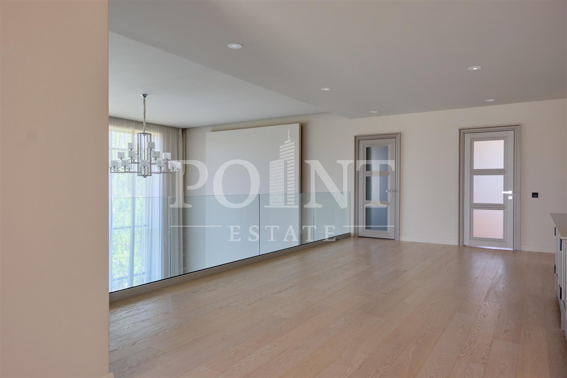 Данный дом выполнен с особым вниманием к деталям. Основная идея заключалась в создании максимального комфорта для жильцов. Устойчивые к климатическим условиям строительные материалы и энергосберегающие технологии делают дом не только эстетичным, но и экономичным в эксплуатации. На 1-ом этаже расположены: кухня-столовая, гостиная со вторым светом и камином, гостиная, кабинет, гостевой санузел, сауна, терраса, холл, хаммам. На 2-ом этаже расположены: спальня с гардеробной и санузлом, три спальни с санузлом, холл, гардеробная, балкон. Каждая деталь, от отделки стен до выбора мебели, тщательно продумана и выполнена с любовью. Среди акцентов можно выделить натуральное дерево, элементы стеклянных перегородок и дизайнерские осветительные приборы.
