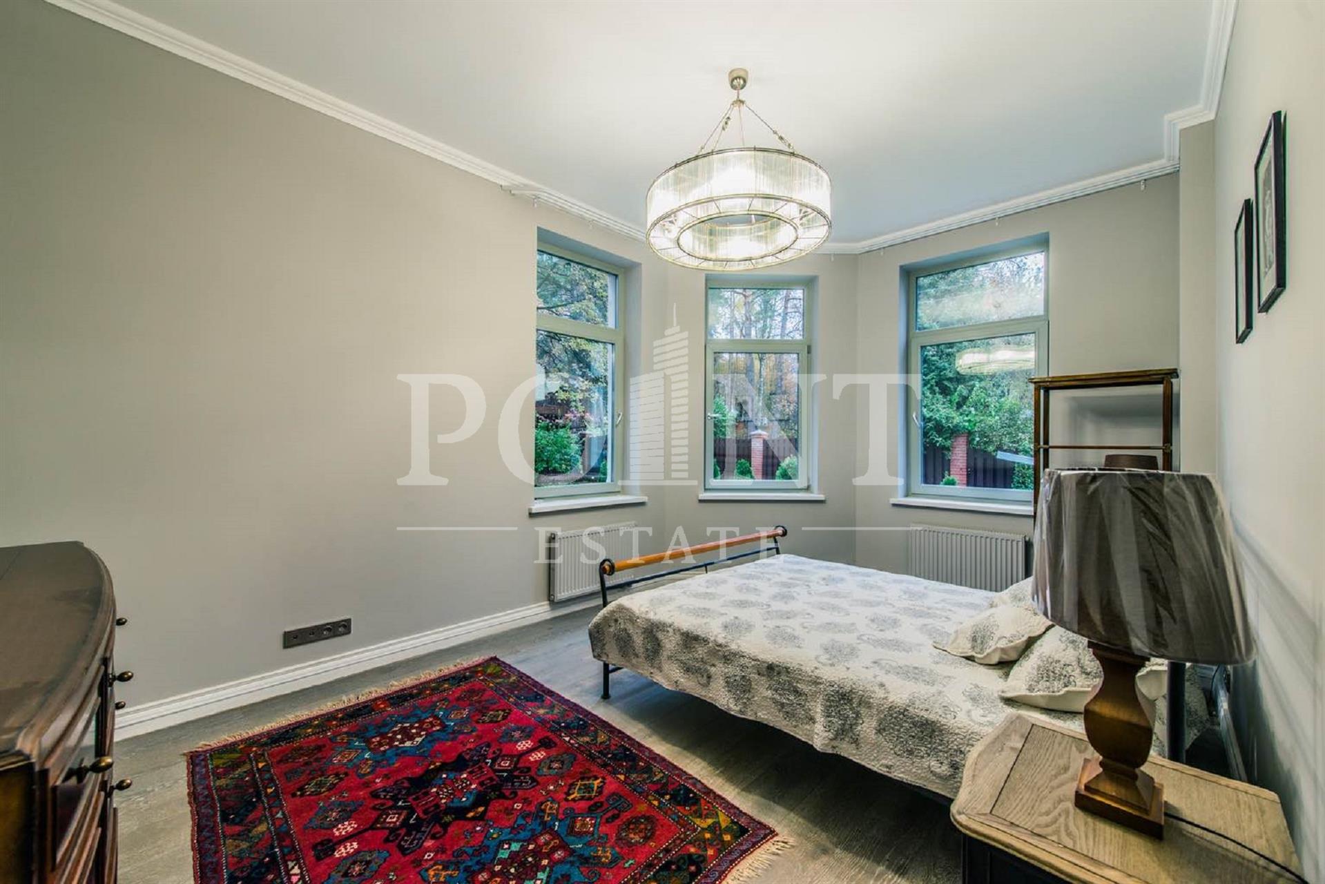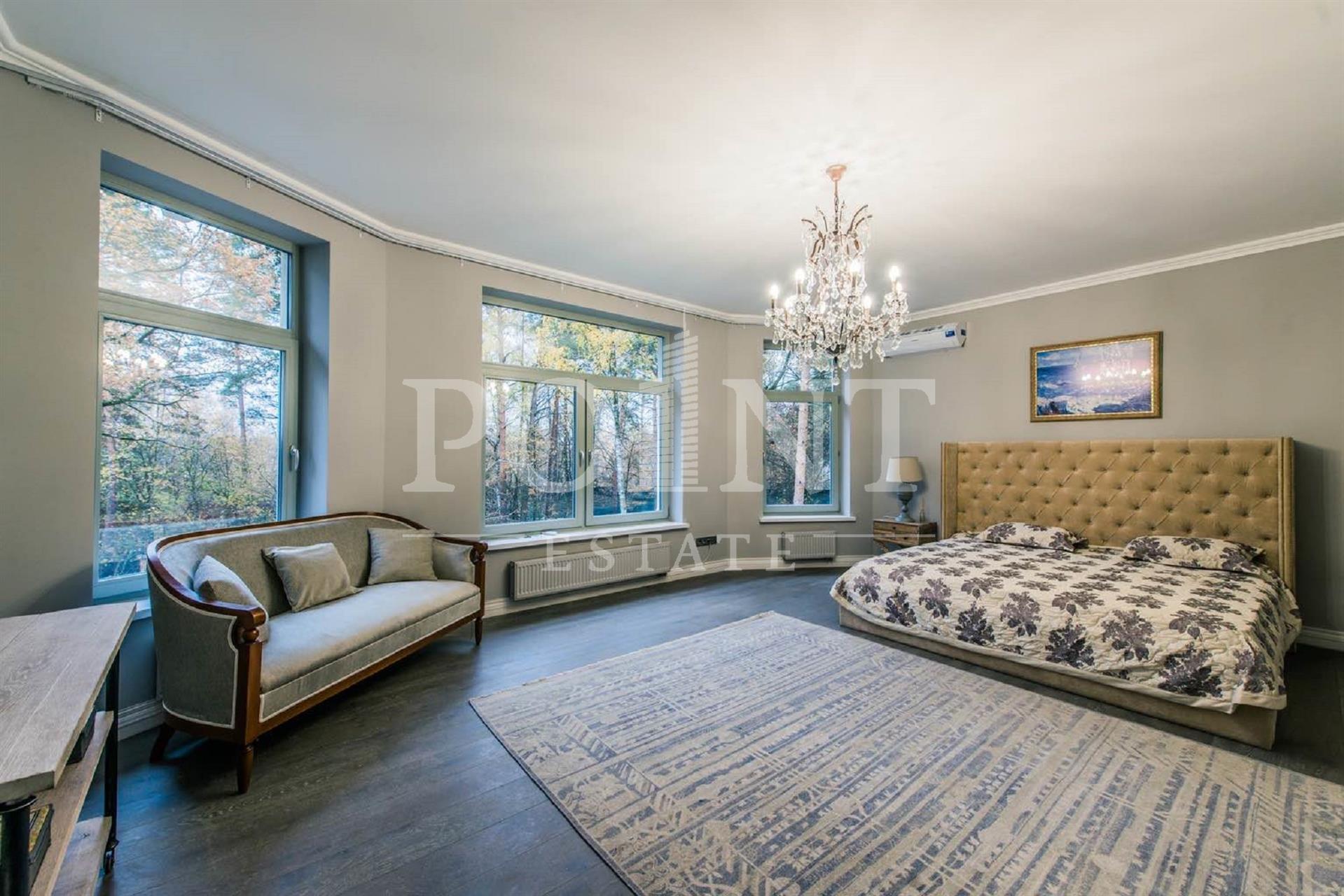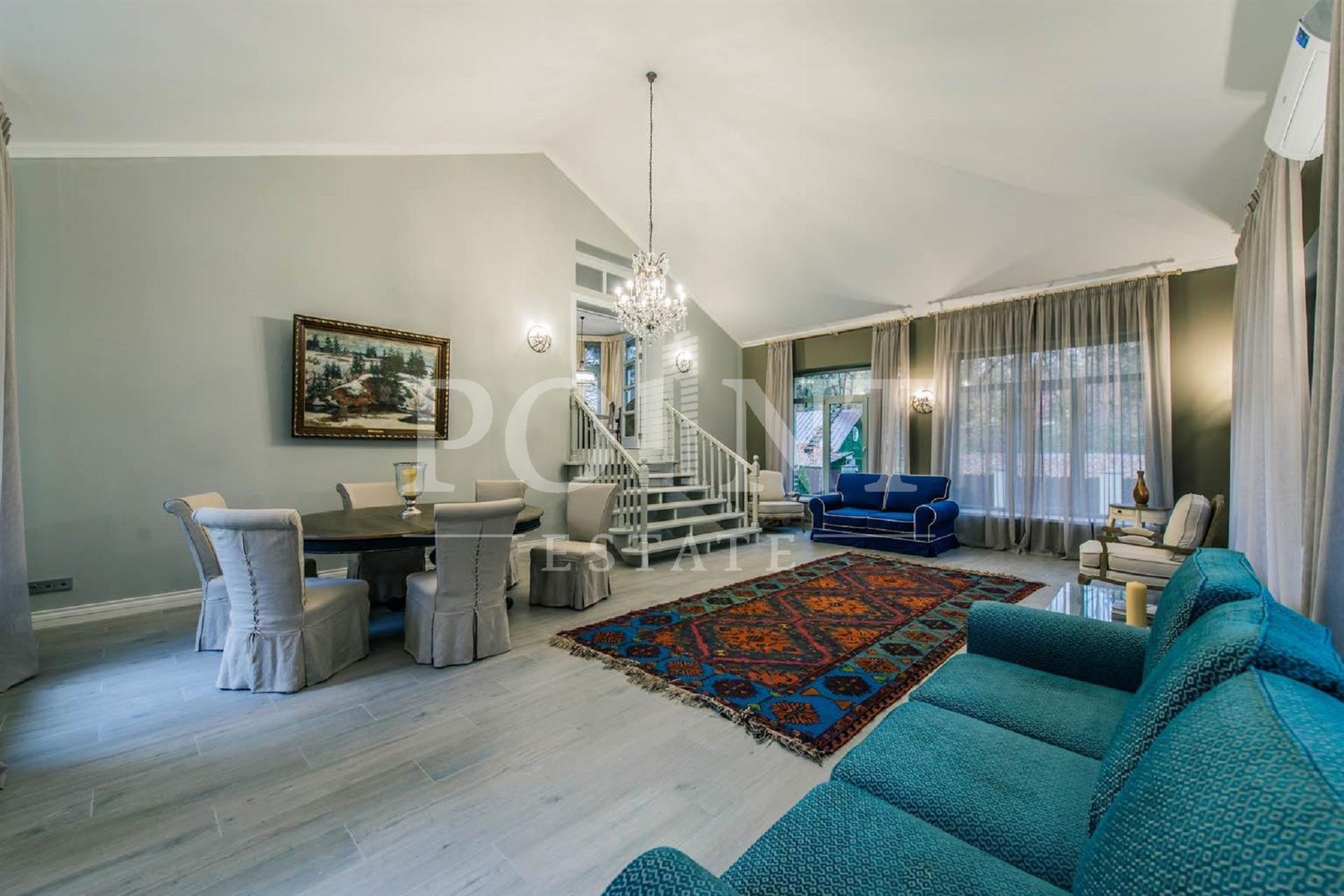 В аренду предлагается четырехуровневый загородный дом площадью 700 кв.м под ключ с мебелью, построенный в лучших традициях классического стиля, на благоустроенном участке 30 соток в живописнейшем уголке Рублево-Успенского шоссе. Интерьерное оформление характеризуется сочетанием современной дизайнерской мысли, изящных классических аксессуаров и эксклюзивной мебели. Дом оснащен системами видеонаблюдения и сигнализации; есть помещение для охраны. На первом уровне (цоколь) находится комната отдыха, сауна, большой холл, санузел, комната персонала, котельная. Второй уровень занимает гостиная с камином, кухня, столовая, большой холл, санузел, гардеробная, комната отдыха. Третий уровень включает в себя спальню с гардеробной и санузлом, спальню с гардеробной, спальню, санузел. На участке предусмотрена парковка на три машино-места.